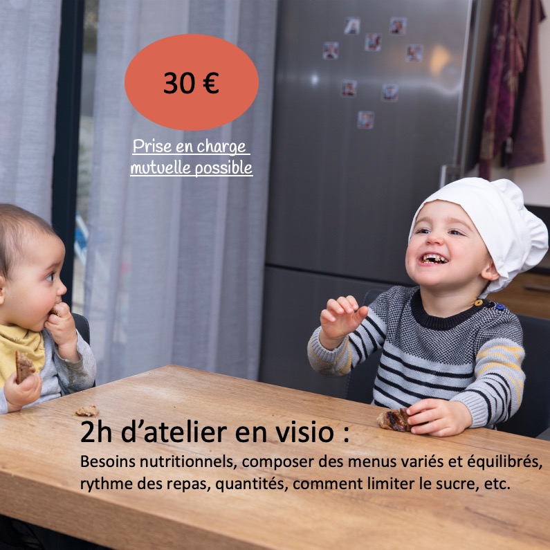Le but de cet atelier en visio (groupe de 10 familles maximum) est de comprendre quels sont les besoins nutritionnels des enfants (et de leur famille) une fois la diversification alimentaire terminée; de vous expliquer comment l'enfant peut se nourrir seul en pleine conscience selon ses propres besoins et sensations; et de vous donner les clés pour proposer des aliments sains, variés et nourrissants sur la table familiale. Nous pourrons bien sûr répondre à toutes vos questions en fin de séance.